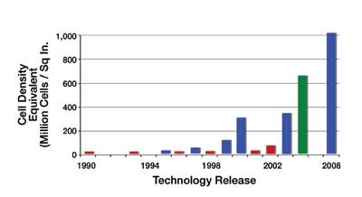 圖2顯示了Fairchild公司≤30V的N溝道MOSFET單元密度的進步。每個條形都表示新的工藝進步。可以看到,在最近的十年中,單元密度從3200萬單元/平方英寸增加到現(xiàn)在的10億單元/平方英寸。