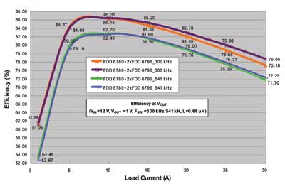 注意上面的兩條曲線,在滿載(30A)時,可以看到最新的器件的效率有1.5%的改進。同樣還是這兩條曲線,在負荷較?。?5A)時,可以實現(xiàn)0.69%的改善。如果對整個負荷范圍積分,那么與今天常見的方案相比,使用最新的MOSFET器件時平均功率損耗可以降低8%~10%。即使在較高的開關頻率541kHz處,可以看到在負荷小時系統(tǒng)級效率仍然高于80%,而在滿載時效率大于70%。如果頻率繼續(xù)增加,那么開關損耗將急劇增加。