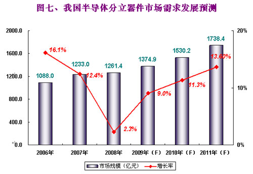 2008年我國分立器件產(chǎn)銷的一大亮點(diǎn)主要得益于全球電子整機(jī)對節(jié)能、環(huán)保需求的不斷增長,這一方面帶動(dòng)了分立器件產(chǎn)品的需求增長,另一方面也帶動(dòng)了市場產(chǎn)品結(jié)構(gòu)的快速升級。銷售額在LED產(chǎn)業(yè)大幅增長的帶動(dòng)下仍增長了12.3%,在二極管、三極管增速相對平穩(wěn)之時(shí),而以MOSFET和IGBT為主的功率晶體管的廣泛應(yīng)用于PC、筆記本電腦、計(jì)算機(jī)電源配件、液晶電視等而得到提升。2008年我國分立器件產(chǎn)量達(dá)到2461.13億只,同比下降1.1%;2008年我國分立器件銷售額達(dá)到937.8億元,同比增長12.3%。(CSIA、CCID年度報(bào)告)
