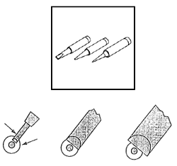 選擇正確的烙鐵頭尺寸和形狀是非常重要的,選擇合適的烙鐵頭能使工作更有效率及增加烙鐵頭之耐用程度。選擇錯(cuò)誤的烙鐵頭會影響焊鐵不能發(fā)揮最高效率,焊接質(zhì)量也會因此而減低。(圖9)