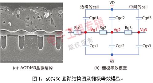 通常從外部來看,MOSFET是一個獨立的器件,事實上,在其內部,由許多個單元(小的MOSFET)并聯(lián)組成,圖1(a)為AOT460內部顯微結構圖,其內部的柵極等效模型如圖1(b)所示。MOSFET的結構確定了其柵極電路為RC網(wǎng)絡。