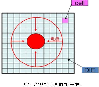 如果MOSFET所加的負載為感性負載,由于電感電流不能突變,導致流過MOSFET的電流向晶元的中間流動,如圖2所示。這樣就會造成MOSFET局部單元過熱而導致MOSFET局部單元損壞。如果加快MOSFET的關斷速度,以盡量讓MOSFET快速關斷,不讓能量產(chǎn)生集聚點,這樣就不會因局部單元過熱而損壞MOSFET。注意到:MOSFET的關斷過程是一個由穩(wěn)態(tài)向非穩(wěn)態(tài)過渡的過程,與此相反,MOSFET在開通時,由于負載的電流是隨著單元的逐漸開通而不斷增加的,因此是一個向穩(wěn)態(tài)過渡的過程,不會出現(xiàn)關斷時產(chǎn)生的能量集聚點。