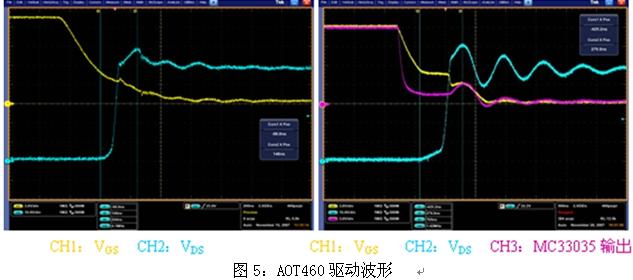 圖4(a)當MOSFET管AOT460關斷時,柵極通過Q5直接放電。圖4(b)驅動電路中,當MOSFET管AOT460關斷時,柵極電流通過電阻R6和MC33035的下驅動對地放電。由于MOSFET管AOT460在關斷時電流迅速減小,會在PCB和電流檢測電阻的寄生電感上產(chǎn)生感應電勢,感應電勢的大小為Ldi/dt,方向如圖紅線所示。這樣會使MOSFET管AOT460的源極和MC33035驅動的參考電位發(fā)生相對變化,這種變化降低了MC33035相對于MOSFET管AOT460源極的驅動電壓,從而降低了驅動能力,使關斷速度變慢。
