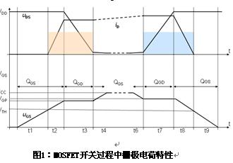 功率MOSFET管的柵極電荷特性如圖1所示,此特性圖可以在MOSFET數(shù)據(jù)表中查到,開通的工作過程可以參閱相關的文獻。值得注意的是:下面的開通過程對應著BUCK變換器上管的開通狀態(tài),對于下管是0電壓開通,因此開關損耗很小,可以忽略不計。