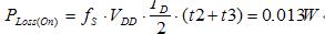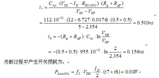 MOSFET開通損耗主要發(fā)生t2和t3時間段。下面以一個具體的實例下計算。輸入電壓12V,輸出電壓3.3V/6A,開關頻率350kHz,PWM柵極驅(qū)動器電壓為5V,導通電阻1.5Ohm,關斷的下拉電阻為0.5Ohm,所用的MOSFET為AO4468,具體參數(shù)如下:Ciss= 955pF,Coss= 145pF,Crss= 112pF,Rg= 0.5Ohm;當VGS= 4.5V,Qg= 9nC;當VGS=10V,Qg= 17nC,Qgd= 4.7nC,Qgs= 3.4nC;當VGS=5V且ID=11.6A,跨導gFS= 19S;當VDS=VGS且ID=250uA,,VTH= 2V;當VGS= 4.5V且ID=10A,RDS(ON)=17.4mOhm。