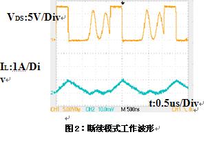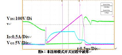 注意到圖1是基于連續(xù)電流模式下所得到的波形,對于非連續(xù)模式,由于開通前的電流為0,所以,除了Coss放電產(chǎn)生的功耗外,沒有開關的損耗,即非連續(xù)模式下開通損耗為0。但在實際的檢測中,非連續(xù)模式下仍然可以看到VGS有米勒平臺,這主要是由于Coss的放電電流產(chǎn)生的。Coss放電快,持續(xù)的時間短,這樣電流迅速降低,由于VGS和ID的受轉(zhuǎn)移特性的約束,所以當電流突然降低時,VGS也會降低,VGS波形前沿的米勒平臺處產(chǎn)生一個下降的凹坑,并伴隨著振蕩。