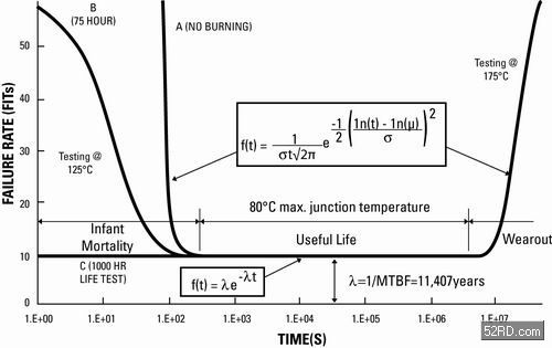 第1個區(qū)段描述了裝置的失敗率。只要在生產(chǎn)裝置中進行若干測試,就可以把故障率降低到一個在實際運行中可以接受的水平。第2個區(qū)段描述了實際工作壽命中有可能出現(xiàn)的隨機故障。它們與時間無關(guān),有關(guān)裝置也不會預(yù)先替換,一般都會在發(fā)生故障時才會被替換。第3個區(qū)段顯示了裝置的壽命接近終結(jié)而開始出現(xiàn)損耗。假如不加以替換,有一半產(chǎn)品都會在壽命中期開始失效。