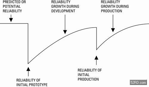 如圖4所示,每個產(chǎn)品壽命周期都包含不同階段的轉(zhuǎn)變,由原型到開發(fā),再由開發(fā)到生產(chǎn),過程中的可靠性會不斷增長。換句話說,每項設(shè)計在其壽命周期中,可靠性都會增加,而成本則會下降。這反映了可靠性的增長不單是設(shè)計工程師的責(zé)任而已。