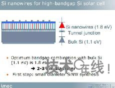 IMEC的目標是實現(xiàn)在硅底板上形成硅納米線的太陽能電池。硅底板的帶隙為1.1eV,而利用量子效應的硅納米線為1.7~1.8eV。組合帶隙不同的硅底板和硅納米線,可期待提高效率。Poortmans表示:“如果這一設想能夠?qū)崿F(xiàn),轉(zhuǎn)換效率將達到約33%”。
