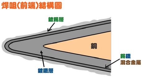 進行焊接時,錫跟鐵會不斷產(chǎn)生混合反應(yīng),而由于所產(chǎn)生的混合金屬會從焊咀鍍層表面剝落,因此焊咀鍍層會逐漸被侵蝕掉,繼而錫會很快速地侵蝕焊咀內(nèi)的銅,最后會在很短時間內(nèi)造成焊咀穿洞(圖4)。