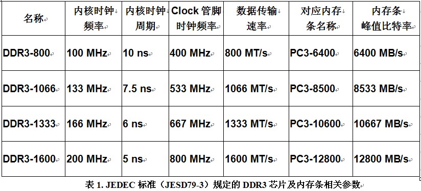 下表列出了JEDEC標準(JESD79-3)規(guī)定的DDR3芯片及內(nèi)存條相關(guān)參數(shù)。需要說明的是,如前所述,并不是所有的內(nèi)存產(chǎn)品都完全遵從JEDEC標準,有些廠商會生產(chǎn)速度更高速的DDR3芯片,一般情況下這些芯片是從芯片檢測流程中篩選出來的頻率動態(tài)范圍更大的芯片,或者是可加壓超頻工作的芯片。
