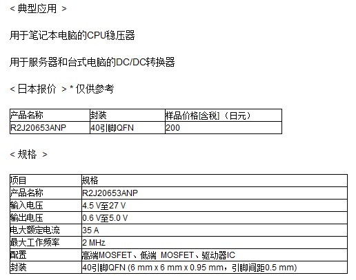 長期以來,瑞薩一直在提供符合DrMOS標準的一系列產(chǎn)品,尤其是輸出電壓為12V的服務器和臺式電腦。新的R2J20653ANP將可承載的輸入電壓擴展到適用于筆記本電腦的20V適配器電壓,成為瑞薩高電壓容限電源類的首款產(chǎn)品。這款產(chǎn)品的推出有助于筆記本用CPU電源在實現(xiàn)更加小型化的同時,達到更高的性能,并且有望帶動DrMOS標準更加廣泛的應用。