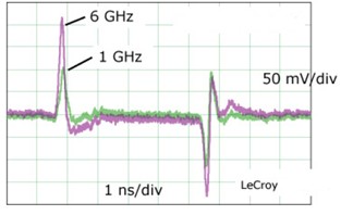 隨著脈沖信號上升沿的加快,信號所包含的諧波成分也越來越豐富。對于同一個脈沖信號,使用不同帶寬的示波器所測量出的結(jié)果可能是不同的。例如,下圖一所示的脈沖測量中,使用1G帶寬的示波器測量到的脈沖幅度僅為使用6G示波器測量值的一半。