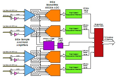 如上圖所示,力科WavePro7Zi及WaveMaster8Zi系列示波器使用了全新的示波器架構(gòu),每顆采樣芯片均可提供最高40GS/s的采樣率(如下圖四所示),在最高80GS/s采樣時僅通過兩顆芯片協(xié)同工作即可完成。這樣的示波器架構(gòu)大大簡化了從前端放大器到ADC采樣芯片之間的信號通路,避免了多顆芯片間隔采樣帶來的沖擊電平噪聲,從而很好地保證了高采樣時的信號一致性。