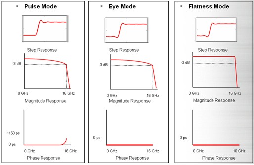 三、支持三種脈沖響應(yīng)方式 —— 業(yè)界唯一當今的高帶寬數(shù)字示波器都會采取某種脈沖響應(yīng)優(yōu)化方式去降低幅頻響應(yīng)或相頻響應(yīng)對被測信號的負面效應(yīng),業(yè)界應(yīng)用最廣泛的脈沖響應(yīng)方式有三種,分別為Pulse Mode、Eye Mode和Flatness Mode。