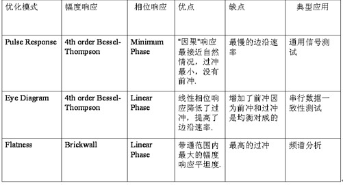 如圖五所示,每種脈沖響應(yīng)方式均由不同的幅頻響應(yīng)及相頻響應(yīng)方式組合而來,對同樣的階躍脈沖信號,不同的響應(yīng)方式將恢復出不同的信號波形。例如,采用Pulse Mode恢復出的波形與模擬示波器的測量效果最為接近,因為其采用的幅頻響應(yīng)更為平緩,同時其相頻響應(yīng)也是因果有界的;采用Flatness Mode恢復出的波形其上升時間最短,但波形中同時包含了更多的過沖成分。這三種脈沖響應(yīng)方式不存在哪個更好的問題,而是分別適應(yīng)了不同信號的測試應(yīng)用需求。下表總結(jié)了三種脈沖響應(yīng)方式的不同特點及其各自適用的領(lǐng)域。