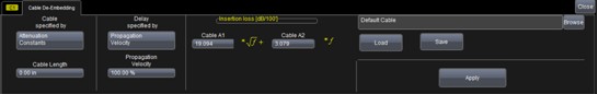 在使用示波器結(jié)合同軸電纜測量脈沖信號時,為保證測量的精確性與一致性,必須去除電纜的效應(yīng)。力科WaveMaster8Zi系列示波器擁有電纜去嵌(cable de-embedding)功能,在每個通道中均可選擇是否激活此功能(下圖所示為cable de-embedding的操作界面)??梢允褂脙煞N方法來輸入電纜的特性:一種是電纜的衰減常數(shù),包括了電纜長度、傳輸速度、插入損耗的多項式系數(shù);另一種是直接輸入多個頻率點的插入損耗(即S參數(shù)的S21)。電纜的特性參數(shù)可以從電纜廠商處獲得,或者使用TDR或矢量網(wǎng)絡(luò)分析儀測量。