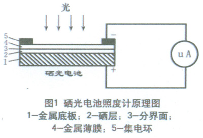 測量照度的儀器是照度計(jì),或稱勒克斯計(jì)。照度計(jì)通常是由硒光電池或硅光電池和微安表組成,見圖1。硒光電池是把光能直接轉(zhuǎn)換成電能的光電元件。當(dāng)光線射到硒光電池表面時(shí),入射光透過金屬薄膜4到達(dá)半導(dǎo)體硒層2和金屬薄膜4的分界面上,在界面上產(chǎn)生光電效應(yīng)。產(chǎn)生電位差的大小與光電池受光表面上的照度有一定的比例關(guān)系。這時(shí)如果接上外電路,就會(huì)有電流通過,電流值從以勒克斯(Lx)為刻度的微安表上指示出來。光電流的大小取決于入射光的強(qiáng)弱和回路中的電阻。照度計(jì)有變檔裝置,因此可以測高照度,也可以測低照度。