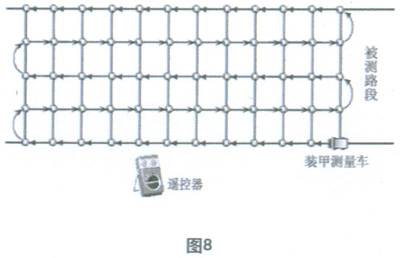 本方案是將具有記憶和存貯功能的TES—1333型照度記安置在高檔電動(dòng)遙控的履帶式玩具裝甲車(以下簡稱為測試小車)上,該測試小車的驅(qū)動(dòng)系統(tǒng)受站在路邊的測量者手中的遙控器和測試小車內(nèi)安置的可編程控制器為主體的自動(dòng)控制系統(tǒng)控制,當(dāng)車內(nèi)的自動(dòng)控制系統(tǒng)啟動(dòng)時(shí),裝甲車將按照事先設(shè)定的動(dòng)作程序沿如圖8所示的箭頭方向完成行走程序,并采用四點(diǎn)法在每個(gè)矩形網(wǎng)格的四角處自動(dòng)完成照度測量和記錄,存貯任務(wù),待全部程序結(jié)束后,測試小車在遙控器的操縱下自動(dòng)返回測量者所在位置。遙控器的另一作用是在車內(nèi)控制系統(tǒng)失靈的情況下,由測量者手動(dòng)遙控完成全部的測量過程,并在道路出現(xiàn)行駛車輛時(shí)緊急召回測試小車。