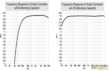 用來隔離DC電流的最常見技術(shù)是采用去耦電容,如圖1所示。在信號(hào)路徑中放置一個(gè)電容可以創(chuàng)建一個(gè)高通濾波器,其角頻率由耳機(jī)阻抗(R)和去耦電容(C)設(shè)置,等于1/(2πRC)。通常人的耳朵能夠聽到聲音頻率最低為20Hz。根據(jù)這個(gè)下限和耳機(jī)的典型阻抗,可很容易地計(jì)算出所需的電容值。對于20Hz的角頻率,電容容值取500uF。