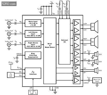如圖三之3D強(qiáng)化立體聲方塊圖所示,一外接之電阻與電容電路用以控制3D強(qiáng)化立體聲之音效,用兩個(gè)分別的電阻與電容電路來(lái)控制立體聲揚(yáng)聲器與立體聲耳機(jī),如此可達(dá)到最佳之3D強(qiáng)化立體聲效果。