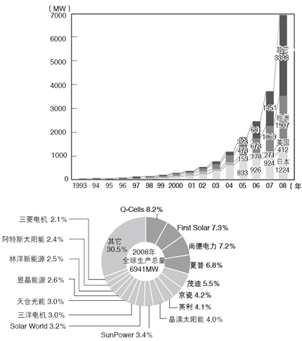 - 全球太陽電池產(chǎn)量急增, 2008年比上年大幅成長了87%,達(dá)到6941MW