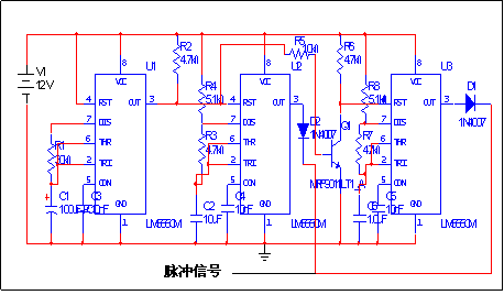 充電電路與脈沖信號結(jié)合,對電路進行充電。這里的脈沖信號可用555定時器來實現(xiàn),用3個555來構(gòu)成一個頻率在周期變化的脈沖信號。電路圖如圖。