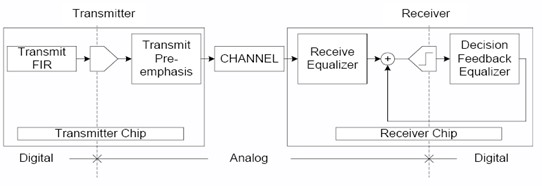 - 接收均衡器receive equalization:接收均衡器通過在接收端放大信號(hào)中的高頻分量來補(bǔ)償傳輸損耗,而低頻分量保持不變,讓信號(hào)眼圖張得最開。是預(yù)加重的一種替代或互補(bǔ)方案。