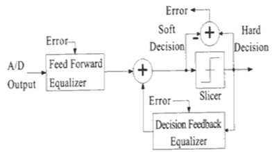 - 判決反饋均衡器Decision feedback equalization (DFE):根據(jù)解碼數(shù)據(jù)改變信號(hào)的幅度,一個(gè)經(jīng)典的判決反饋均衡器的結(jié)構(gòu)如圖3所示。