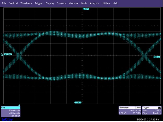 信號(hào)經(jīng)過背板和連接器,到達(dá)接收端,信號(hào)變差,眼圖變小,如圖8、圖9所示。如果不使用均衡技術(shù),系統(tǒng)很容易出現(xiàn)誤碼,因此在高速接收芯片內(nèi)部通常需要嵌入均衡器。