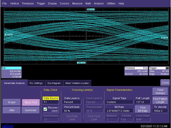 由于在SERDES接收芯片內(nèi)部集成了均衡器,以補(bǔ)償信號(hào)的過大衰減,但是測(cè)試時(shí),直接測(cè)量接收端的信號(hào)基本沒有意義,因?yàn)檫@根本無法代表接收信號(hào)的真實(shí)性能。在示波器內(nèi)部集成濾波器,讓客戶訂制濾波功能來仿真接收芯片的均衡特性,是目前高速測(cè)試的解決方案之一。