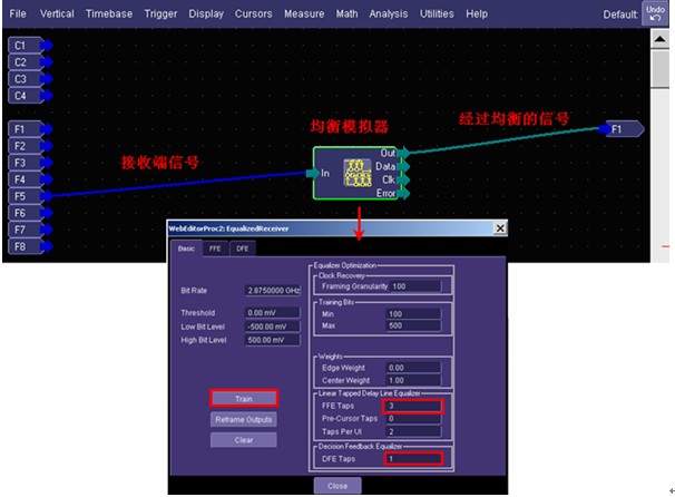 把經(jīng)過背板的已衰減信號(hào)加到示波器的均衡模擬器上,查看經(jīng)過均衡的信號(hào)眼圖。根據(jù)接收芯片實(shí)際情況,我們把FFE和DFE的抽頭數(shù)分別設(shè)為3和1,點(diǎn)擊Train,對(duì)均衡器進(jìn)行訓(xùn)練(圖12),就得到了均衡后的信號(hào),其眼圖如圖13所示。