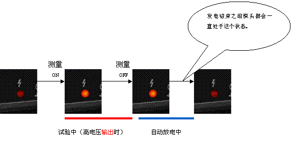 這個探棒前端的小按鈕跟主機上面的“MEASURE(測量)”按鈕一樣,只是單純的控制電壓輸出的嗎?其實不然。仔細(xì)看會發(fā)現(xiàn),在電壓輸出的時候,紅色的指示燈會亮。那也就是說,這個按鈕是與主機上面的閃電標(biāo)識(請看上面提到過的“自動放電功能”的說明)連動的。也就是說,有以下兩個作用: