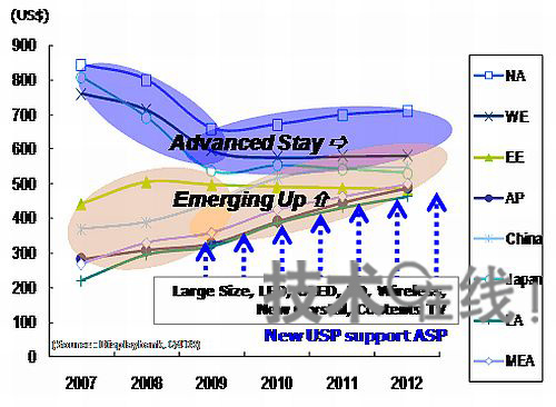 分地區(qū)看電視的平均銷售價格(ASP)變化可預(yù)測,發(fā)達(dá)國家市場的ASP暴跌將告一段落,而在新興市場國家,隨著FPD電視的增加和屏幕大型化,ASP將會繼續(xù)上漲。另外,估計(jì)LED背照燈液晶電視、3D電視、IPTV及無線功能等的普及也會成為推高ASP的因素。