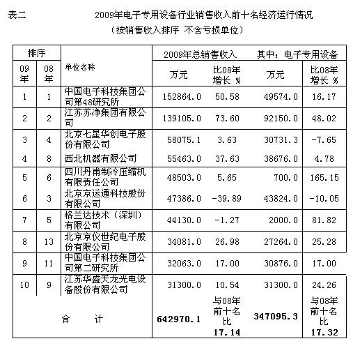 2009年電子專用設(shè)備行業(yè)前十名銷售收入總額達(dá)到64.3億元,占全行業(yè)銷售收入的69.9(2006年為61% 2007年為63.9% 2008年為66.5%),比2008年的前十名銷售收入增長17.14%。入圍前十名的銷售收入也從2008年的2.82億元提高到2009年的3.13億元。中國電子科技集團(tuán)公司第四十八研究所,2009年在太陽能設(shè)備和太陽能電池片的推動(dòng)下得到了快速的發(fā)展,總銷售收入達(dá)到15.3億元,繼續(xù)位居行業(yè)的首位。