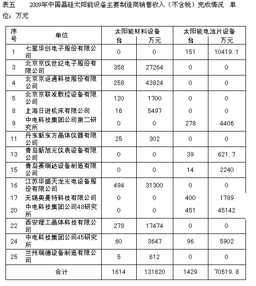 2009年下半年在光伏產(chǎn)業(yè)市場的推動(dòng)下,我國晶硅太陽能設(shè)備得到迅速復(fù)蘇,2009年我國主要太陽能電池制造商太陽能設(shè)備銷售收入比2008年增長了14.44%,達(dá)到20.21億元。其中:太陽能級(jí)晶硅生長和加工設(shè)備增長7.34%,達(dá)到13.16億元,占太陽能電池設(shè)備銷售收入的65.1﹪(2008年為69.4%);晶硅太陽能電池芯片制造設(shè)備增長30.56%,達(dá)到7.05億元,占太陽能電池設(shè)備銷售收入的34.9﹪。