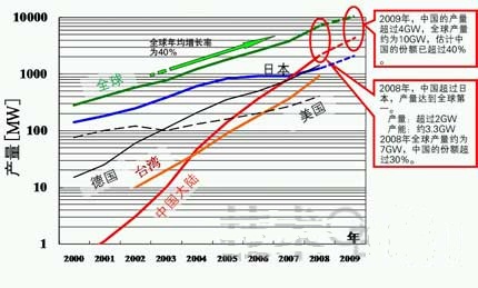 - 2008年中國的太陽能電池產(chǎn)能約為3.3GW,產(chǎn)量超過了2GW