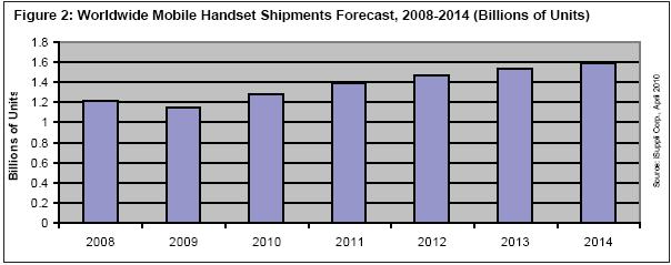 考慮到手機(jī)市場(chǎng)在2009年第四季度回升,以及歐洲、拉美和中東/非洲地區(qū)第四季度表現(xiàn)出色,可以說(shuō)手機(jī)產(chǎn)業(yè)已經(jīng)正式結(jié)束衰退。iSuppli公司認(rèn)為,今年整體手機(jī)出貨量繼續(xù)增長(zhǎng)——預(yù)計(jì)增長(zhǎng)11.3%至13億部,進(jìn)一步支持上述看法。