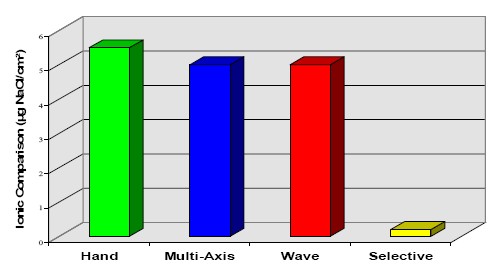 選擇焊只是針對所需要焊接的點進行助焊劑的選擇性噴涂,線路板的清潔度因此大大提高,離子污染量大大降低。助焊劑中的NA+ 離子和CL-離子如果殘留在板子上,時間一長會與空氣中的水分子結(jié)合形成鹽從而腐蝕線路板和焊點,最終造成焊點開路。因此,傳統(tǒng)的生產(chǎn)方式往往需要對焊接完的線路板進行清潔。而選擇焊則從根本上解決了這一問題。
