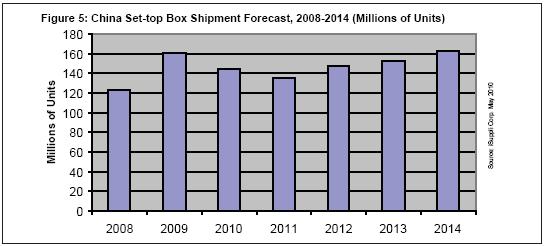 2009年中國總體機(jī)頂盒出貨量達(dá)到1.605億臺,比2008年的1.234億大增30%。iSuppli公司的圖表顯示,這些數(shù)據(jù)證明中國已成為全球最大的機(jī)頂盒生產(chǎn)國,以及領(lǐng)先的機(jī)頂盒設(shè)計(jì)中心。
