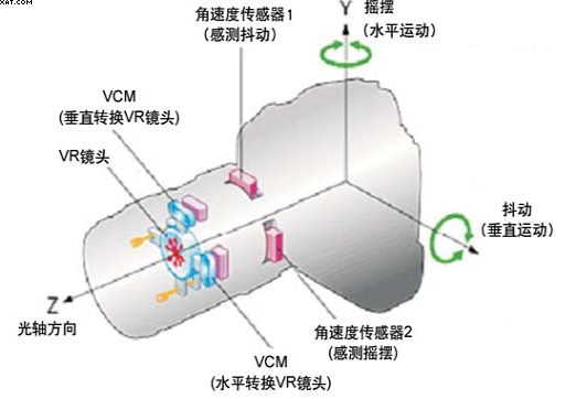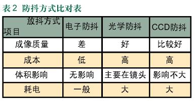 鏡頭防抖是通過鏡片的移動來補償相機的抖動,它由傳感器,微處理器,補償鏡片控制組,驅(qū)動控制部分組成,依靠補償鏡片的移動來校正手抖引起的光線偏移,如圖1,鏡頭不同,設計上有差異,但基本上都是透過補償鏡片組來補償。CCD防抖是通過感光元器件CCD(或CMOS)放在一個可移動支架上來,通過傳感器感知相機的抖動,由微處理器計算相應的移動量,由驅(qū)動部分對CCD移動,以達到防抖目的。目前,一般相機的防抖(CCD防抖或光學防抖)不是無限可以補償,一般為2~~3級,按表一來說,假設安全快門1/125,2級,快門速度1/30,快于此速度,容易拍清晰的照片,由此類推,3級,快門速度為1/15。表2為三種防抖方式的比對表。