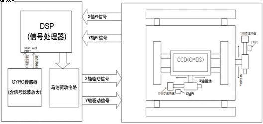 由圖2看出,在3D圖面上,Z軸有自動聚焦功能,Z軸移動對成像基本沒有影響,有影響是在X軸(PITCH)與Y軸(YAW)。圖4為在晚上拍照,無防手抖與有CCD防手抖的結(jié)果。圖5為CCD防抖系統(tǒng)框架,CCD防抖是在鏡頭上增加CCD支架,利用步進馬達對X軸,Y軸的驅(qū)動,使CCD移動來補償CCD的抖動。MEMS陀螺儀選用要有X,Y軸Gyro芯片,內(nèi)部含放大,低通,高通濾波,這樣可以大大減少相機的尺寸。Gyro信號連DSP的ADport,DSP的AD是10bit,滿足設計要求。資料運算用相機本身的DSP處理,可以減少一微處理器(Micro),降低成本。DSP對Gyro傳來的ω信息進行運算,計算補償量,通過馬達驅(qū)動電路驅(qū)動X,Y移動來達到補償?shù)哪康摹軸,Y軸的PI信號是Lens反饋DSP信息來校正CCD與Lens中心重合,避免補償過程超出Lens設計的補償范圍。
