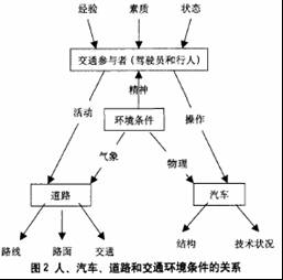 汽車道路交通事故是世界性的災(zāi)害,因此汽車交通安全也是世界性的難題。道路交通事故引起人的傷亡,財產(chǎn)的損失,給國民經(jīng)濟(jì)也帶來了巨大的損失。然而誘發(fā)交通事故的因素是多方面的,它受汽車行車速度、道路條件、車輛狀況、駕駛員行為、駕駛員的文化素質(zhì)和自然環(huán)境等因素的綜合影響。其中人、汽車、道路、環(huán)境條件是影響道路交通安全的主要因素,它們之間的關(guān)系見圖2。