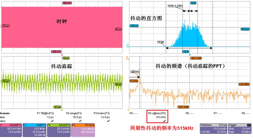 左下角的F4為TIE track(即TIE抖動隨時間變化的趨勢),從TIE Track中可以看到周期性的變化趨勢;右下角的F5是F4的FFT運算,即抖動的頻譜,頻譜的峰值頻率為515kHz,說明該時鐘的周期性抖動(PJ)的主要來源為515kHz,找到頻點后,可以查找電路板上主頻或諧波為該頻率的芯片和PCB走線,進一步調試與分析。時鐘抖動的分解