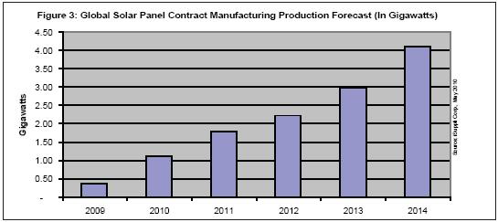 2010年合同制造商將生產(chǎn)1.1GW的太陽能電池板,比2009年時的369MW大增200%。其余的生產(chǎn)任務(wù)將由專門的太陽能電池板廠商以及其它企業(yè)承擔(dān)。2014年合同制造商生產(chǎn)的太陽能電池板將比2010年增長近三倍,達(dá)到4.1GW。