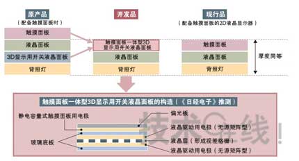 關(guān)于②,由于開(kāi)發(fā)品需要采用開(kāi)關(guān)液晶面板,因此厚度大于普通2D液晶顯示器不可避免。于是夏普將目光投向了逐步被普通手機(jī)及智能手機(jī)等采用的觸摸面板。具體方法是,將開(kāi)關(guān)液晶面板與觸摸面板合為一體(圖1)。注3)這是通過(guò)在開(kāi)關(guān)液晶面板的正面形成靜電容量式觸摸面板用電極而實(shí)現(xiàn)的。據(jù)介紹,通過(guò)這種方法,實(shí)現(xiàn)了與配備觸摸面板的2D液晶顯示器同等的厚度。