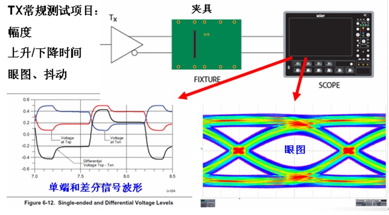 對于絕大多數(shù)高速串行信號的測量,通常包括了發(fā)送端測量和接收機測量,又稱為TX測量和RX測量。目前,對于板級設(shè)計的硬件工程師,對發(fā)送端測試已經(jīng)非常熟悉。通常使用高帶寬示波器加上測試夾具或差分探頭來測量,測試項目主要是眼圖、抖動、上升/下降時間、幅度等等,探測點的位置一般是串行鏈路的發(fā)送端或接收端,由于測量的都是高速收發(fā)器芯片發(fā)送出的信號,對于這一類測試通常都稱為發(fā)送端測試,如下圖2為典型的TX測試的示意圖。