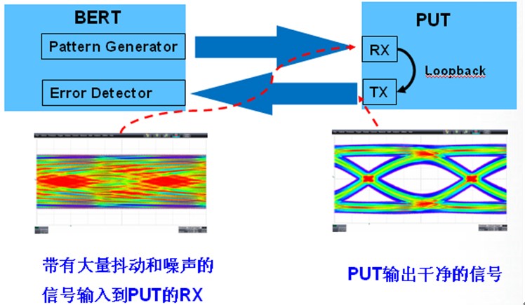 圖3為接收機測試的示意圖。接收機測試所需的儀器是誤碼率測試儀(簡稱BERT),BERT通常包括碼型發(fā)生器(Pattern Generator)和誤碼檢測器(Error Detector)兩部分。在接收機測試時,碼型發(fā)生器輸出特定碼型的、帶有大量抖動和噪聲的信號到待測試產(chǎn)品(Product Under Test,簡稱PUT)的RX,PUT接收到后通過時鐘與數(shù)據(jù)恢復(fù)電路(簡稱CDR)、判別電路和解碼得到1和0組合的比特流,然后環(huán)回到輸出寄存器,從PUT的TX緩沖器發(fā)送出去,PUT的TX連接到了BERT的誤碼檢測器,誤碼檢測器中的CDR、判別電路處理后解碼得到1與0組合的數(shù)據(jù)比特流,然后與碼型發(fā)生器輸出的特定碼型數(shù)據(jù)對比,如果兩者完全吻合則沒有誤碼,否則,記錄下誤碼的數(shù)量和接收到的碼流的比特總數(shù),前者除以后者即誤碼率,同時記錄接收到誤碼時碼型發(fā)生器輸出信號的抖動值。如果用示波器測量PUT的RX端接收到的信號的眼圖,通常是閉合的,如圖3的左下圖所示;如果用示波器測量PUT的TX端輸出信號的眼圖,通常是良好的眼圖,如圖3右下圖所示。修改碼型發(fā)生器輸出信號的隨機抖動、固有抖動、信號幅度等參數(shù),可以快速評估PUT的接收機性能。