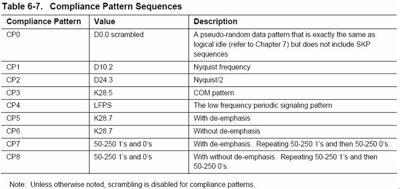 在USB3.0規(guī)范中定義了多種兼容性測試碼型(Compliance Pattern,簡稱CP),如下圖4所示包括了CP0-CP8九種測試碼型。在TX測量中,需要用到CP0/CP1/CP7/CP8四種碼型:CP0用于眼圖與抖動、共模電壓測量;CP1用于SSC展頻測量、隨機抖動測量;CP7用于去加重測量;CP8用于差分電壓幅度測量。