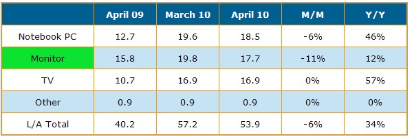 根據(jù)DisplaySearch最新關(guān)于4月份大尺寸TFT LCD出貨量報(bào)告指出,4月份大尺寸面板出貨量達(dá)5千3百90萬(wàn)片,較3月份下滑6%;出貨金額為71億美元,與上月相比下滑4%。不過相比較2009年4月份出貨情況,今年4月出貨量較去年增加34%,出貨金額增加達(dá)72%之多。
